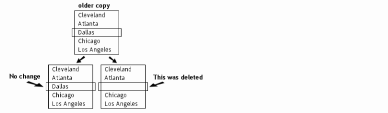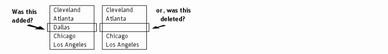 一个 合并 会话帮助合并几组不同的变动至新的数据,使之适应不同的变化。 首先考虑简单的两侧比较例子。 如果某个内容仅在一侧显示而在另一侧没有显示,则比较无法判断两侧修改的先后顺序:该内容是否是被后来添加到某一侧,还是后来从另一侧删除掉: 不过如果我们能够引入更原始的数据,则有助于提供更多的合并信息。 举例说,从更原始的数据出发,我们能够判断一个内容究竟是被新加入某一侧或者在另一侧被刚刚删除: 这种情况下,程序能够迅速准确的帮助合并不同的更改。 这个功能被称作三方合并。 注意,不是所有修改都能够被成功合并而无需人工检查。 如果同一行文字在两侧被同时修改(并修改至不同内容),该行则被标志为 冲突 需要检查。 |