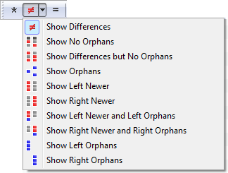 显示过滤器限制。 例如,可以选择 显示差异 大部分会话类型都会具备一些过滤器的功能。 下面的例子来自文件夹比较会话。 右键点击工具栏或者使用内置方法之一去打开显示过滤器: 下拉列表, 收藏夹 or 切换。 或者使用 工具 > 自定义命令 下拉列表 下拉列表是工具栏的默认风格,用于简化并节省工具栏空间。 该按钮表示显示所有 收藏夹布局 收藏夹类型包括工具栏中各种过滤器的组合。 切换布局 切换表示单项比较状态。 当需要其它显示过滤器无法提供的组合时,选择该模式。 例如,上述切换将仅仅显示 左侧孤立项 和 右侧较新项,而不显示其它内容。 |