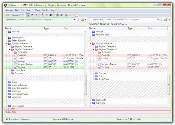 一个注册表比较会话比较本地计算机或网络上其它计算机的实时注册表 .reg将文件导出至并排显示。