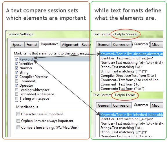 在Beyond Compare中,文件类型通过定义元素描述特殊类型文件的语法。 文件类型通常被自动选中,基于文件名的扩展名。 一个文本比较会话定义哪个元素相对比较更重要。 注意到这个会话用更抽象的方式设置处理元素,且不同的文件格式处理语法细节。 去改变一个元素类型缺省的重要性: